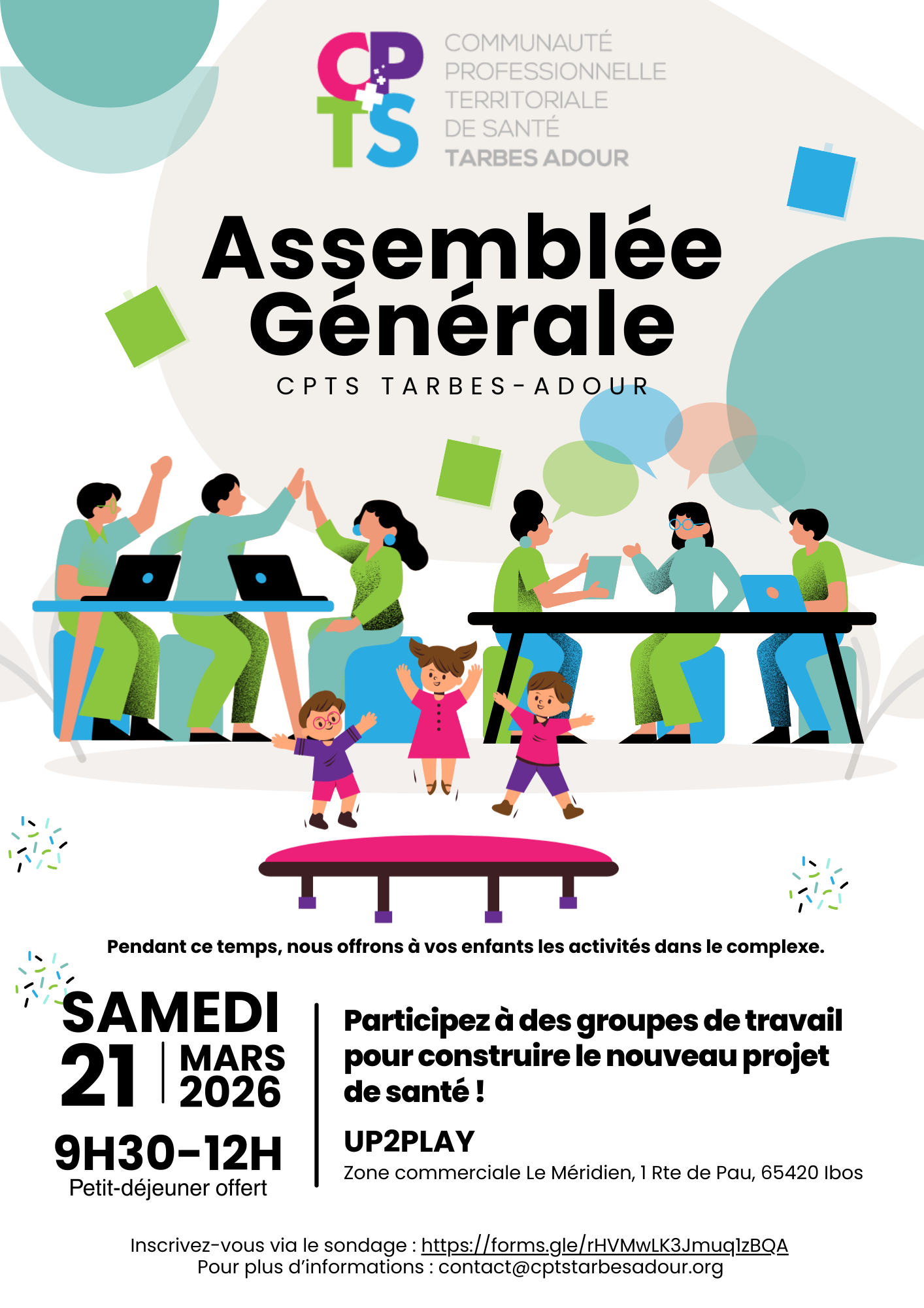 Nos adhérents sont conviés le samedi 21 mars à 9h30 pour l'assemblée générale de la CPTS Tarbes-Adour.