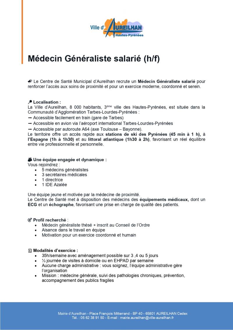 Le centre de santé municipal d'Aureilhan recrute un Médecin Généraliste salarié (h/f)